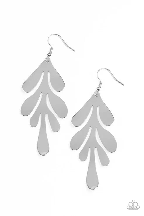 Featuring a gently beveled finish, a flat silver leaf abstractly swings from the ear for a flashy seasonal finish. Earring attaches to a standard fishhook fitting.