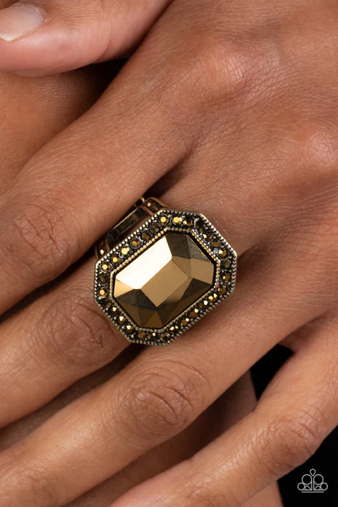 An oversized, aurum, emerald-cut gem smolders inside a framework of studded brass texture and glitzy aurum rhinestones, resulting in an awe-inspiring statement piece that glamorously sits atop the finger. Features a stretchy band for a flexible fit.