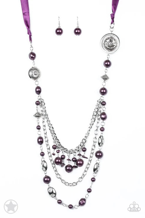A silky purple ribbon replaces a traditional chain to create a timeless look. Pearly deep purple beads and funky silver pieces intermix with varying lengths of silver chains to give a fresh take on a Victorian-inspired piece. Sold as one individual necklace. Includes one pair of matching earrings.
