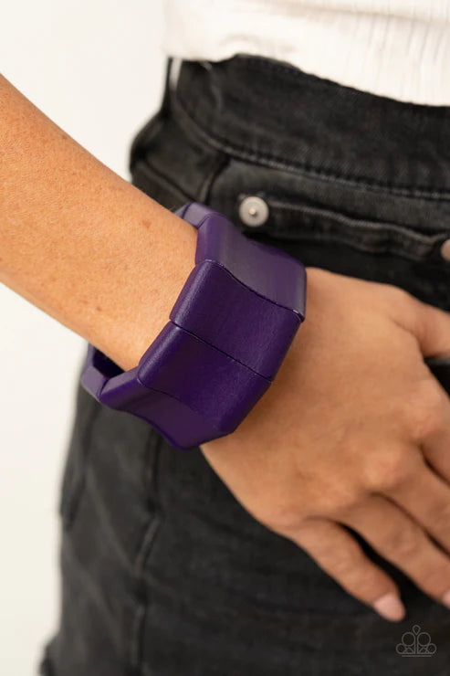 Featuring curved rectangular shapes, oversized vivacious purple wooden beads are threaded along stretchy bands around the wrist for a bold summer look.