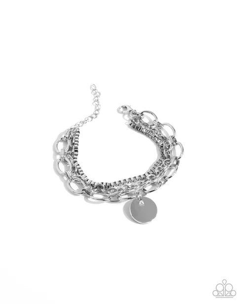 Dotted with a solitaire white rhinestone, a singular silver coin-like disc sways from a layered collection of mismatched paperclip, cable, and box silver chains for a mesmerizing, monochromatic display. Features an adjustable clasp closure.