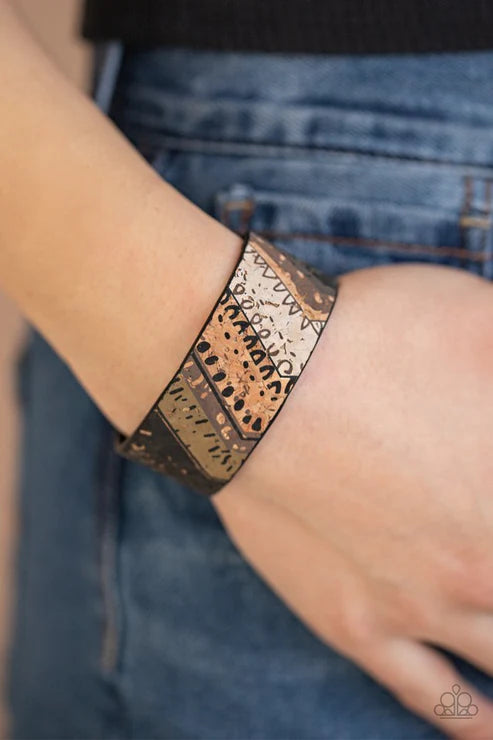 Featuring refreshing white accents, patches of cork-like textures coalesce across the front of a cuff for a tribal inspired look. Sold as one individual bracelet.