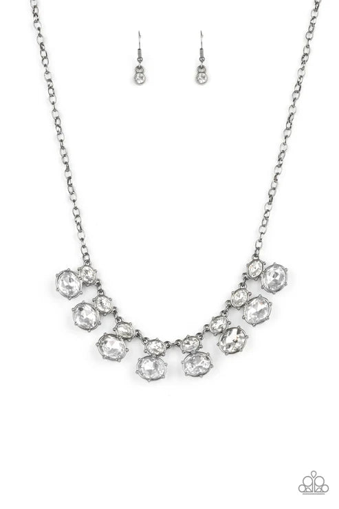 Double stacks of brilliant white oval cut gems link elegantly across the collar on a gunmetal chain for a deliriously cosmic flair of glamour. Features an adjustable clasp closure.