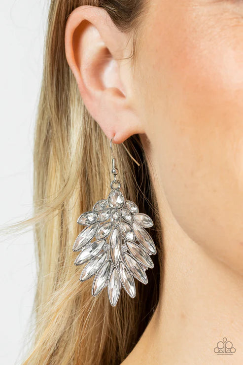 A glassy white teardrop rhinestone gives way to a sparkly fan of classic white and oblong marquise cut rhinestones, coalescing into an out-of-this-world statement piece. Earring attaches to a standard fishhook fitting.