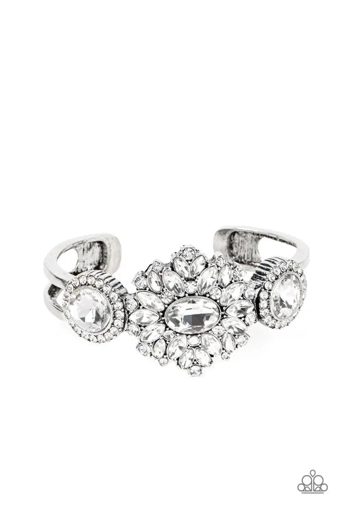 A decadent explosion of dainty white rhinestones and teardrop gems frame a reflective oval gem at their center. On either side of the shimmery centerpiece dainty white rhinestones encircle reflective white gems that are pressed into thick silver frames. The trio of sparkling gems floats on airy silver cuffs that loop around the wrist in a dazzling finish.
