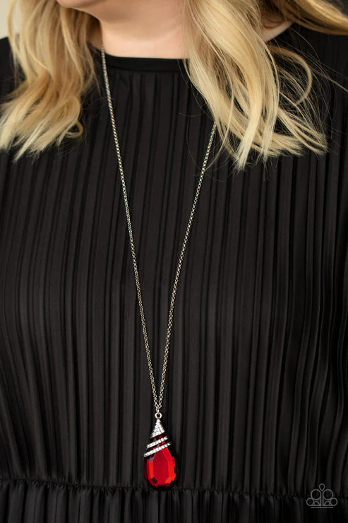 Capped in a white rhinestone encrusted fitting, glittery silver ribbons of white rhinestones delicately wrap around the top of a dramatically oversized red teardrop gem. The fiery red pendant swings from the bottom of a lengthened silver chain, creating a glamorous statement piece. Features an adjustable clasp closure.