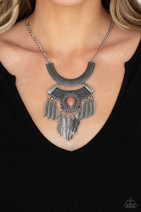 A brown teardrop stone dots an ornately scalloped silver frame that adorns the center of a curved metal plate that links to the bottom of an oversized curved studded plate. Mismatched silver feathers trickle from the bottom of the stacked pendant, creating a whimsical fringe. Features an adjustable clasp closure.