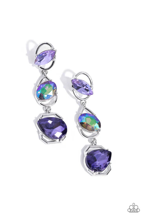 Linking together to create a geometric lure, a sleek silver oval, teardrop, and emerald-cut frame cascade down the ear. Slanted sideways in pronged settings across each frame, a dark purple teardrop, UV purple oval-cut gem, and light purple marquise-cut gem create a gorgeous pop of color against the thin edgy frames. Earring attaches to a standard post fitting.