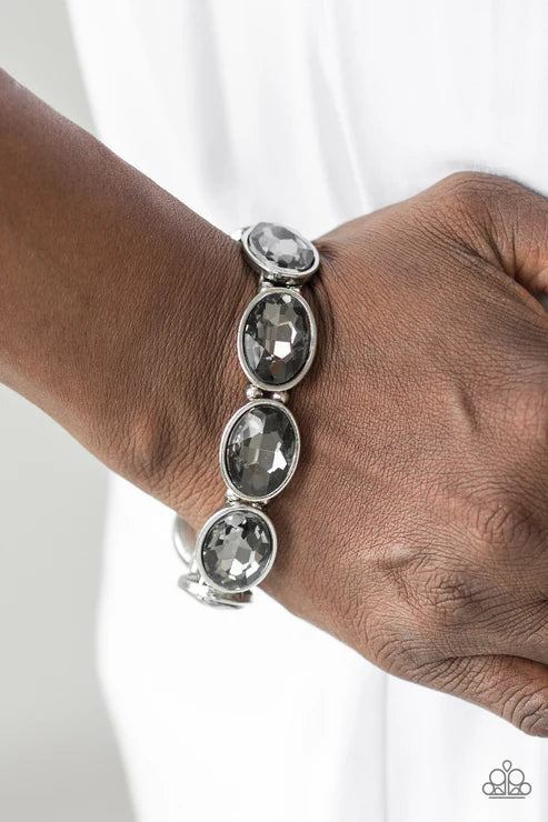 Smoky gems are pressed into sleek silver frames. Infused with dainty silver beads, the glittery frames are threaded along stretchy elastic bands for a glamorous look around the wrist.