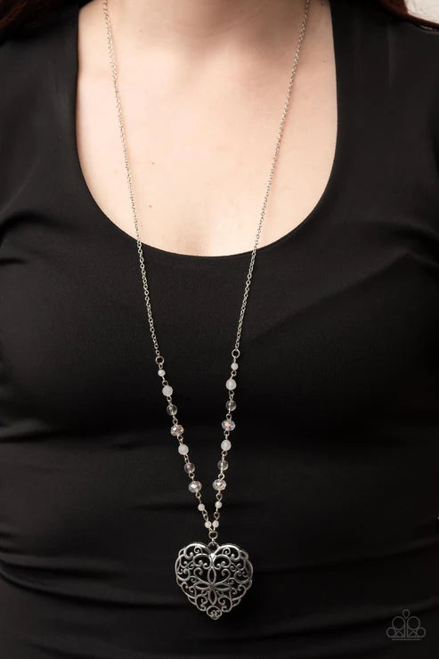 Featuring opaque and glassy crystal-like finishes, a dainty collection of white beads gives way to an oversized filigree filled heart frame, creating an antiqued locket inspired pendant at the bottom of a lengthened silver chain. Features an adjustable clasp closure.