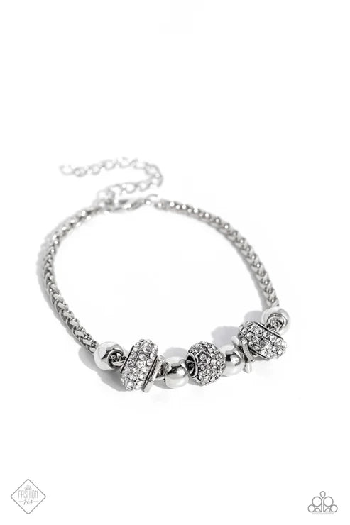 Round and cylindrical shimmery silver beads, infused with sparkling white rhinestones, slide along a thick silver chain, while glistening silver star silhouettes - also embossed on the rhinestone-encrusted beads in a daintier size - create a star-struck finish around the wrist. Features an adjustable clasp closure.