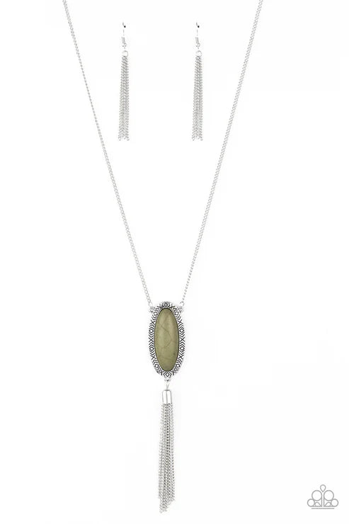 An oval Military Olive stone is pressed into a glistening silver frame stamped in antiqued tribal inspired patterns. A shimmery silver chain tassel swings from the bottom of the earthy pendant for a whimsical finish. Features an adjustable clasp closure.