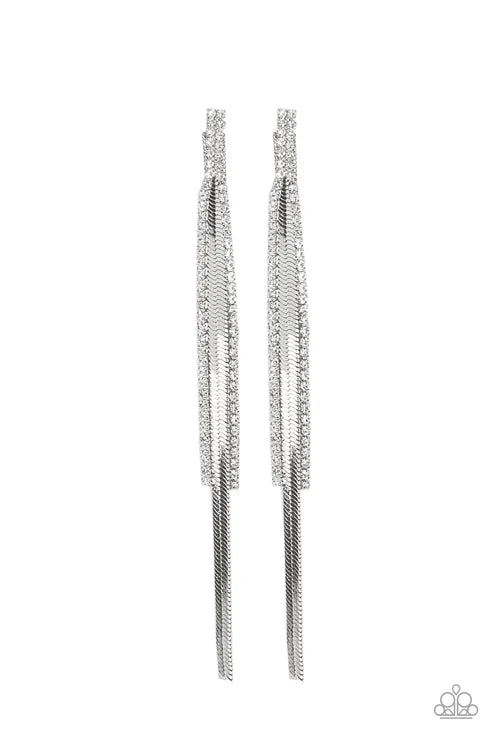 Two strands of dainty white rhinestones join a flat silver chain, coalescing into an edgy lure. Earring attaches to a standard post fitting.