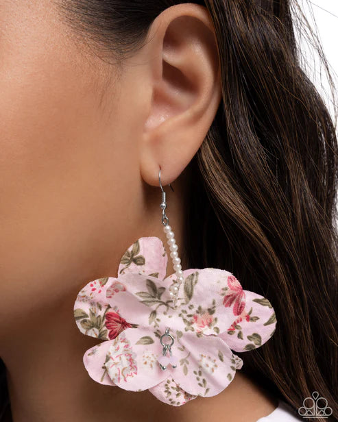 Delicate pink floral-patterned fabric petals bloom into a charming layered flower. Dainty faceted light pink beads cluster together in the petals as they sway from dainty rows of pearls, creating a lightweight and feminine feeling. Earring attaches to a standard fishhook fitting.