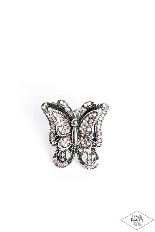 Dazzling iridescent rhinestones are sprinkled across the wings of a silver butterfly, creating a whimsical frame atop the finger. Features a stretchy band for a flexible fit. Due to its prismatic palette, color may vary.