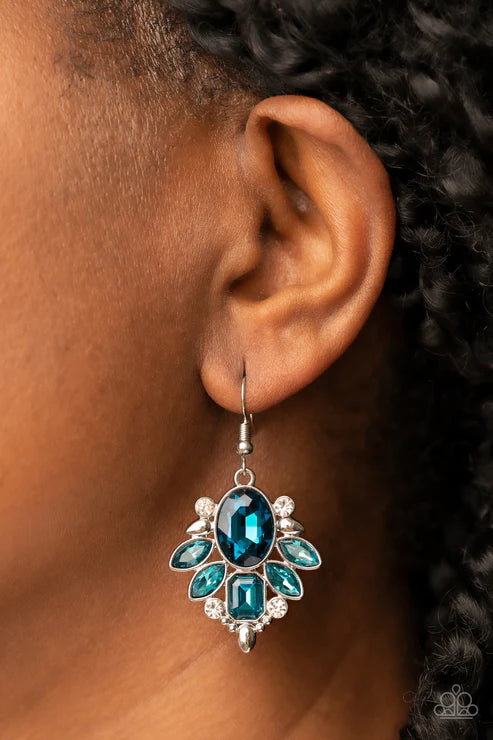 A brilliant blue gem makes a sparkling centerpiece amidst a glitzy fringe of marquise and emerald-cut blue rhinestones resulting in a timeless lure. Earring attaches to a standard fishhook fitting.