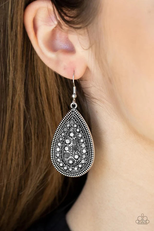 A dotted silver teardrop frame encompasses faceted hematite rhinestones. The dainty glimmering rhinestones are layered in an echoing teardrop design for a polished finish. Earring attaches to a standard fishhook fitting.