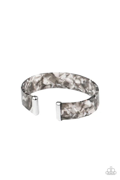 Capped in sleek silver fittings, a black and white tortoise shell-like acrylic frame delicately curls around the wrist, creating a dainty cuff.