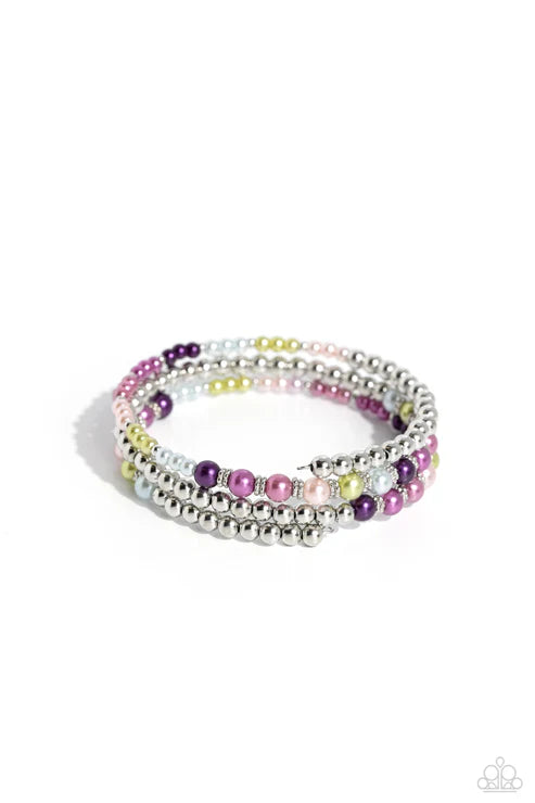 A collection of bright multicolored pearls and shiny silver beads and accents are threaded along a wire that coils around the wrist, creating an eye-catching infinity wrap style bracelet.