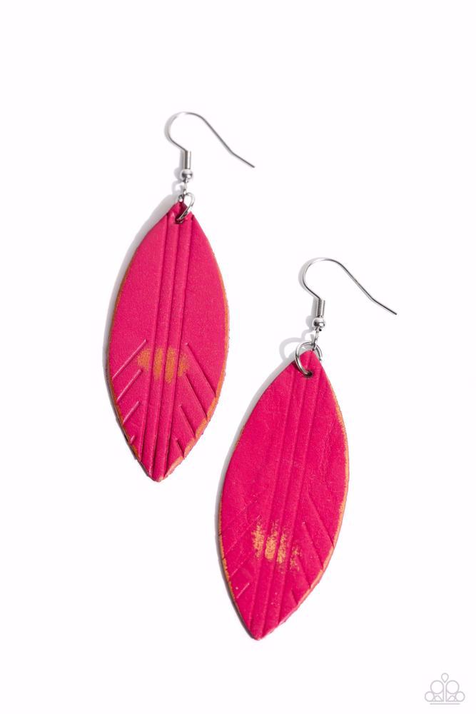 A distressed pink leather frame is stamped in geometric linear patterns, resulting in a rustic lure. Earring attaches to a standard fishhook fitting.