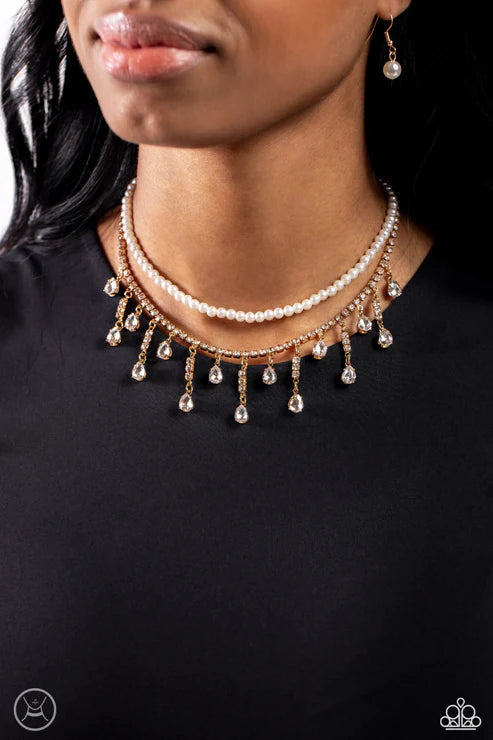 Featuring a white rhinestone square-fitting chain, white teardrop-cut gems, bordered in gold pronged fittings, swing from streams of glittery rhinestones while solitaire teardrop gems drip in an alternating pattern. A strand of gleaming white pearls layers above the golden display for a luxurious finish around the collar. Features an adjustable clasp closure.