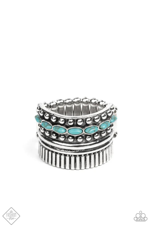 A wide silver band is overlaid with layers of linear texture, smooth silver bars, and antiqued studs. A row of dainty almond shaped turquoise stones flows across the band, adding a splash of color atop the finger. Features a stretchy band for a flexible fit.