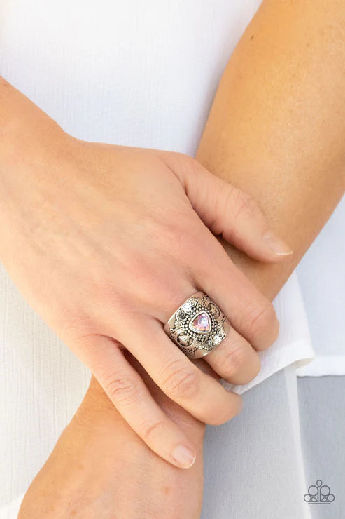 Featuring an iridescent shimmer, a triangular purple rhinestone is pressed into the center of a thick silver band embossed in whimsically studded patterns for an enchanted finish. Features a stretchy band for a flexible fit.