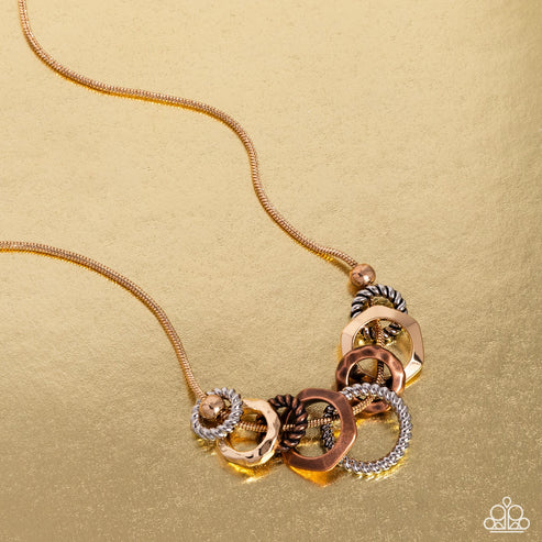 A gritty assortment of ropelike rings, hammered rings, and faceted rings in gold, silver, and copper finishes glide along a rounded gold snake chain, creating an intense industrial display below the collar. Features an adjustable clasp closure.
