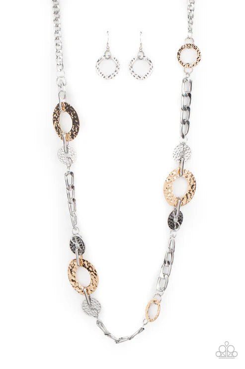 A hammered collection of silver discs, gold rings, and sections of chunky silver chain boldly link across the chest for an intense industrial style. Features an adjustable clasp closure.