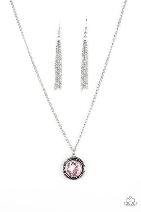 A glittery pink gem is pressed into a studded silver frame, creating a glamorous pendant below the collar. Features an adjustable clasp closure.