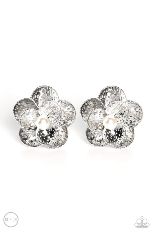 Flaring out from a white pearl center, silver flowers, featuring studded petals, grace the ear. An oversized silver flower, featuring the same studded design as the smaller flower, creates the 3D design and draws additional attention to the whimsical design. Earring attaches to a standard clip-on fitting.