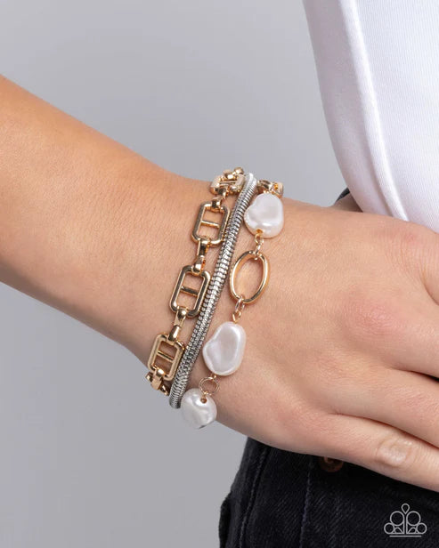Three strands of silver snake, baroque white pearls, and gold anchor chains collide into one fashion-forward statement around the wrist. Features an adjustable clasp closure.
