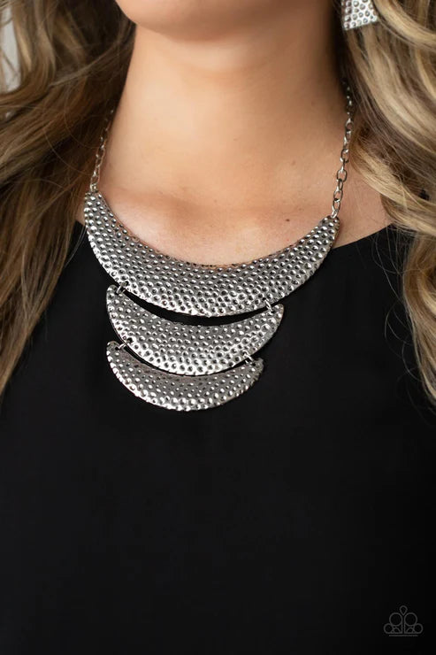 Hammered in an antiqued silver dimpled texture, a trio of crescent shaped plates in graduating sizes stack one above the other and connect to a silver chain for a boldly modern fashion below the collar. Features an adjustable clasp closure.