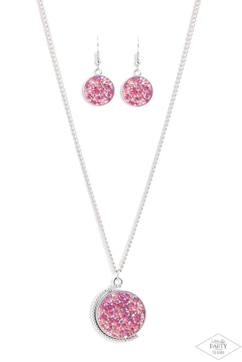 A smoldering collision of blue iridescent and pink iridescent rhinestones are encrusted across the front and back of a textured silver disc below the collar. Threaded along a dainty rod, the glittery pendant effortlessly spins on its axis inside a silver studded half-circle frame. Features an adjustable clasp closure. Due to its prismatic palette, color may vary.