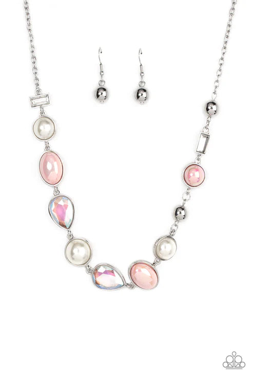 A collection of classic white pearls, iridescent Pale Rosette beads, white emerald cut gems, and iridescent crystal-like teardrops dance below the collar for an ethereal display. Shiny silver frames encase each bead, adding a romantic vibe to the vintage inspired design. Features an adjustable clasp closure.