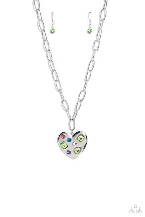 Falling down the neckline from a shimmery silver paperclip chain, an oversized silver heart rests for a romantic statement. Brushed with shimmery pink, purple, white, blue, and green gems in round, teardrop and emerald cuts, the colors sparkle and shine for a dazzling finish. Features an adjustable clasp closure.