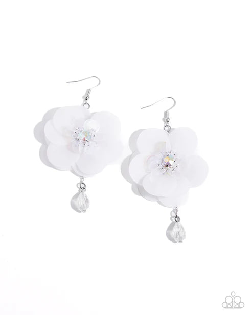 Featuring iridescent sequin petals, larger white sequin petals fan out around an iridescent rhinestone. The elaborate floral centerpiece gives way to a faceted clear white teardrop bead for a refining finish. Earring attaches to a standard fishhook fitting. Due to its prismatic palette, color may vary.