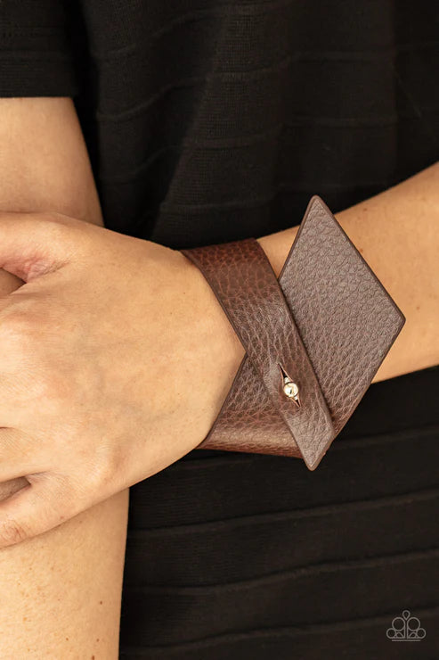 A triangular piece of brown leather delicately wraps around the wrist, creating an edgy asymmetrical centerpiece around the wrist. Features a studded button loop closure.