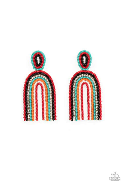 Infused with a single row of glassy white rhinestones, dainty strands of red, black, turquoise, orange, white, and red seed beads stack into a colorful rainbow at the bottom of a matching seed beaded fitting. Earring attaches to a standard post fitting.