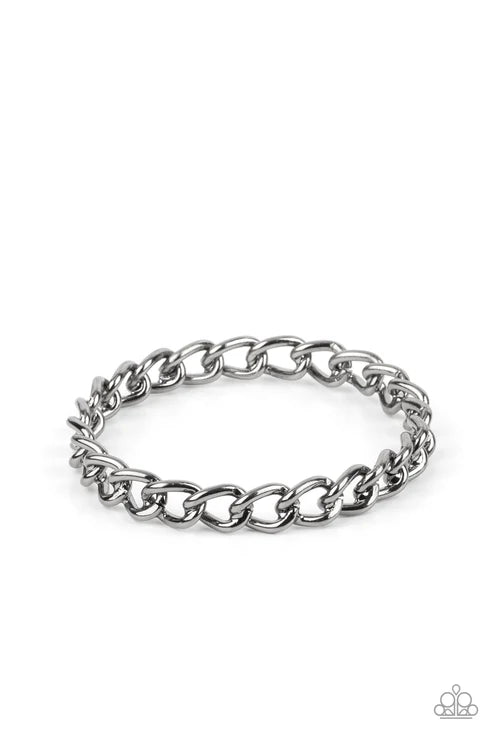 A single strand of bold gunmetal chain links into a solid bangle around the wrist for an intense industrial fashion.