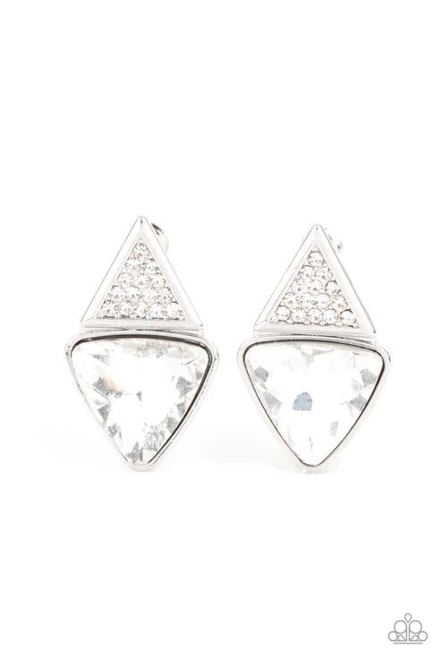 Encrusted in glassy white rhinestones, a dainty silver triangle frame attaches to an oversized white triangular gem for a modern twist. Earring attaches to a standard post fitting.