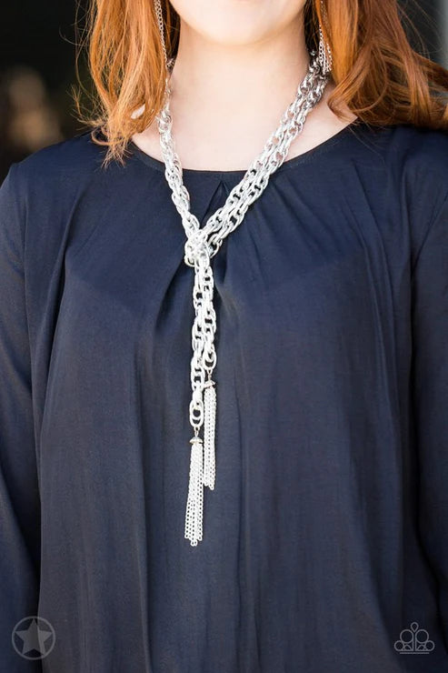 A single strand of spiraling, interlocking links with light-catching texture is anchored by two tassels of chain that add dramatic length to the piece. Undeniably the most versatile piece in Paparazzi's history, the scarf necklace features FIVE different ways to accessorize: Open Layer, Loop, Traditional Wrap, Double Knot, and Nautical Knot. Sold as one individual necklace. Includes one pair of matching earrings.