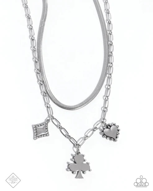 A flat, silver snake chain is suspended above a silver paperclip chain, layering into a dynamic lineup of high-sheen grit. A white stud and white rhinestone-bordered heart pendant, white rhinestone-bordered diamond-shaped pendant, and white pearl-bordered club pendant sway along the silver paperclip chain for a serendipitously sentimental statement. Features an adjustable clasp closure.