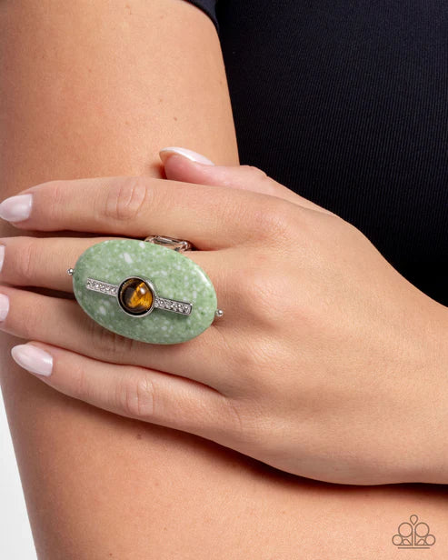 Featuring white spots, an over-the-top oversized green oval stone stands out atop the finger for an eye-catching display. Dainty white rhinestones pressed in a silver bar are placed atop the center of the stone interrupted by a glistening tiger's eye stone for an eclectically earthy centerpiece. Features a stretchy band for a flexible fit. As the stone elements in this piece are natural, some color variation is normal.
