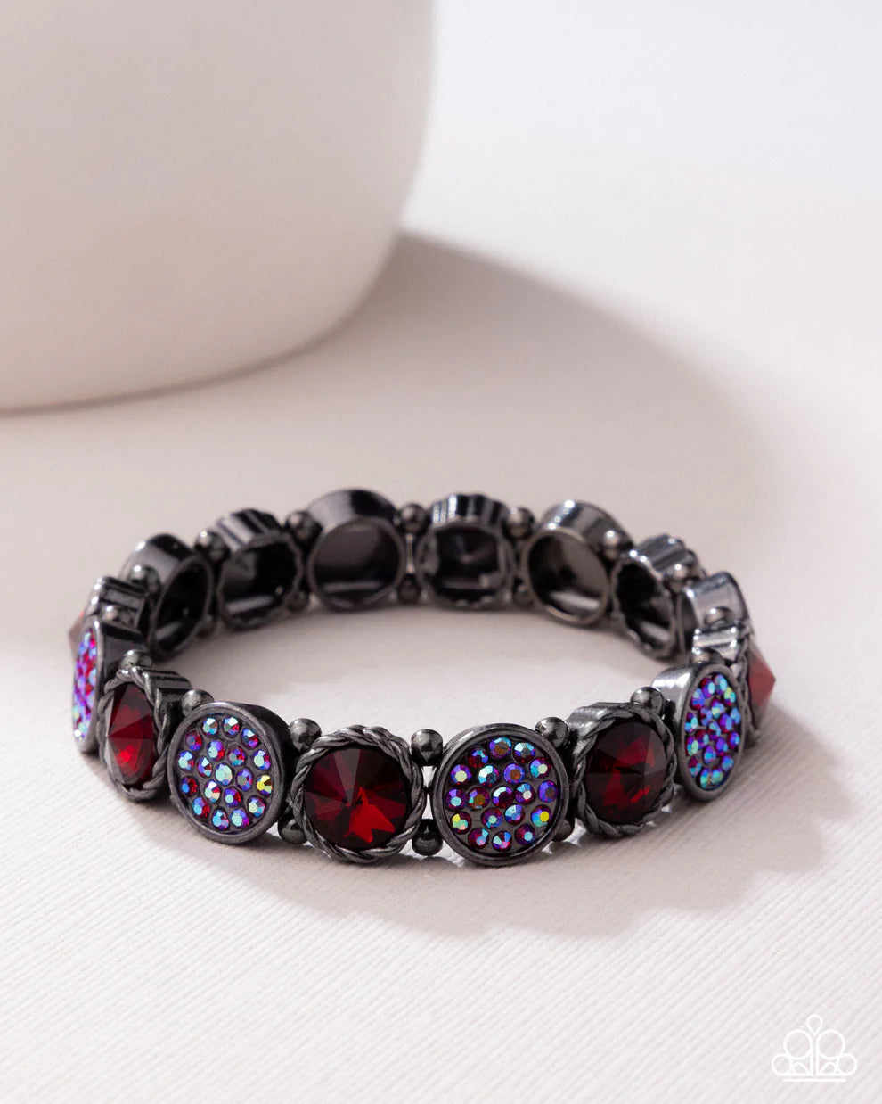 Featuring an array of glittery red and red iridescent rhinestones, mismatched gunmetal frames and dainty gunmetal beads are threaded along stretchy bands around the wrist for a glamorous flair. Due to its prismatic palette, color may vary.