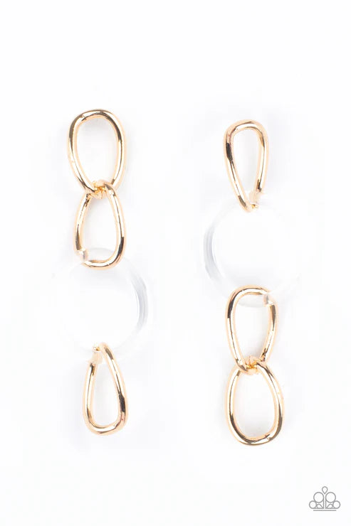 Bright gold oversized links, interrupted by a single large clear acrylic ring, fall from the ear in linked succession for an on-trend fashion statement. Earring attaches to a standard post fitting.