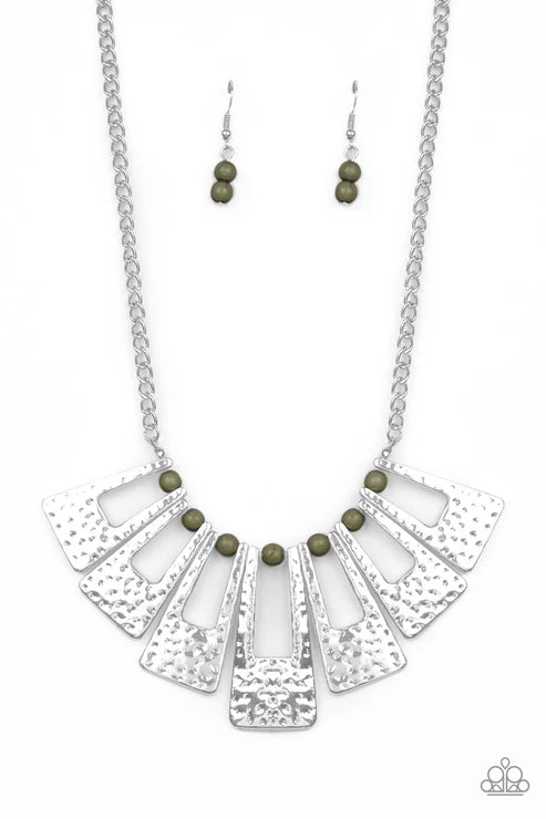 Infused with dainty green stone beads, hammered silver rectangular frames fan about below the collar for a bold seasonal look. Features an adjustable clasp closure.