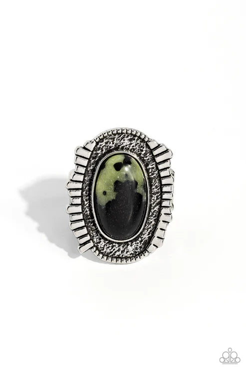 A speckled green stone adorns the hammered center of an oversized silver frame adorned in an asymmetrical silver fringe for a hint of artisan edge. Features a stretchy band for a flexible fit.