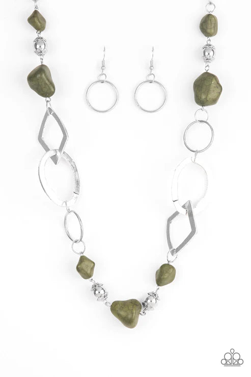 Bits of green stones and ornate silver beading give way to asymmetrical silver frames. The mismatched frames drape across the chest, creating an earthy collision of rock and metal. Features an adjustable clasp closure.