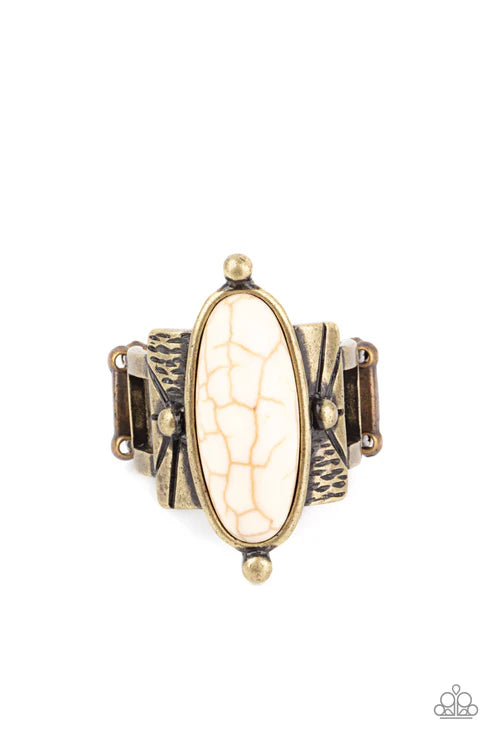An oval white stone is nestled inside a studded brass fitting that sits atop a decorative brass frame stamped in tribal inspired textures, creating a rustic centerpiece. Features a stretchy band for a flexible fit.